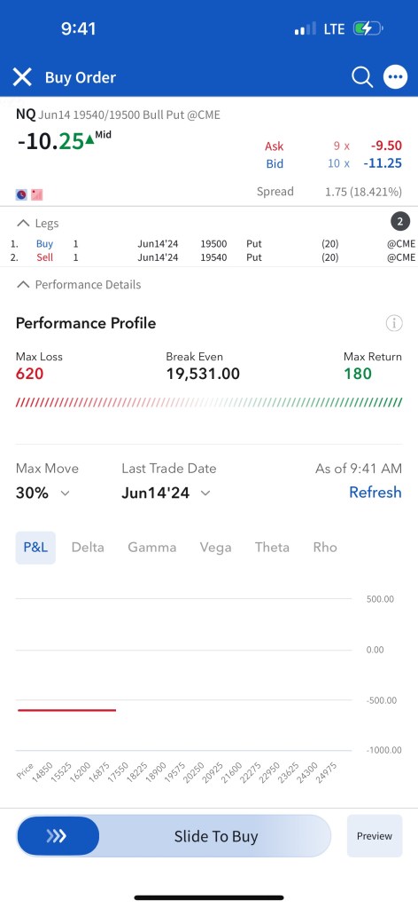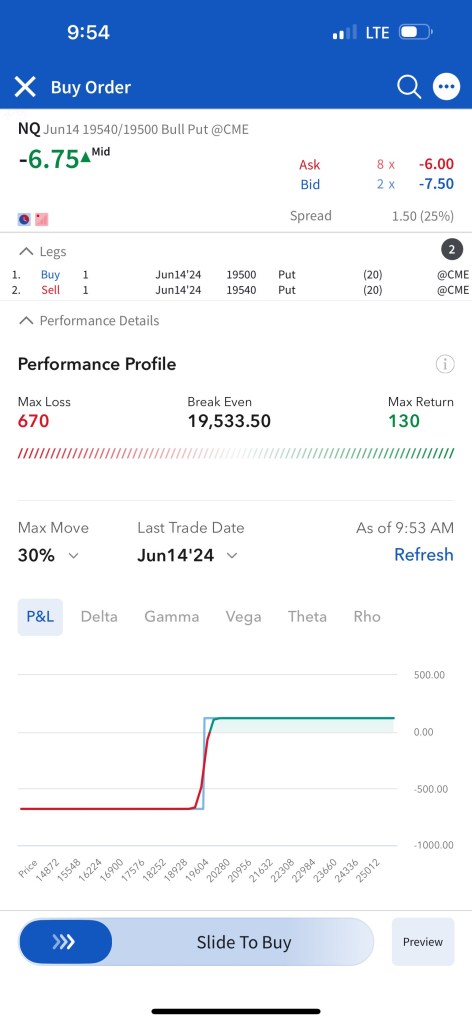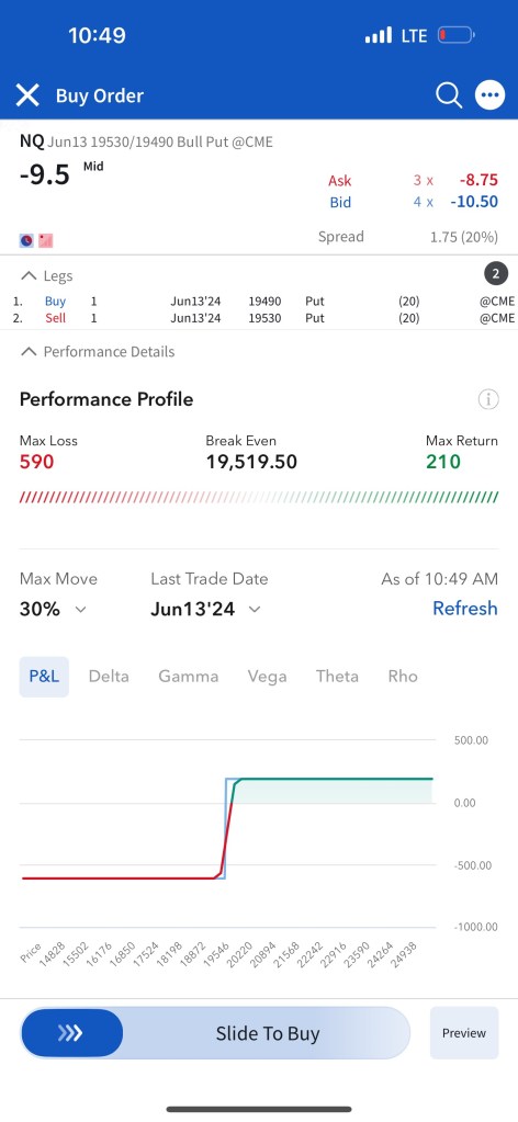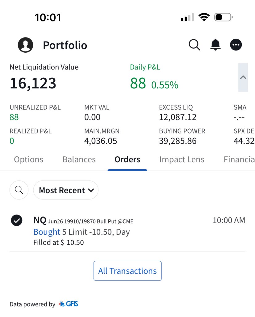 Trade #1: I have followed through on the trade plan mentioned yesterday in Tomorrow’s Trade Ideas. I had to make a slight adjustment as the NQ contract that is currently the one being shown in TradingView (The one expiring Sep 20) is not liquid enough, so I continued to trade the one expiring June 21st. The support of $19,800 I mentioned in Tomorrow’s Trade Ideas is equivalent to a support of $19,550 for the June 21 NQ contract. I have “paper” sold 5 bull put spreads with a short strike price of $19,540 and a long strike price of $19,500 for a premium of $10.25 per contract. Netting me a total of $1,025 in premium ($10.25*5*20). Each contract represents exposure to 20 futures. My max loss here is $2,975. I will be looking to close if and when NQ makes a move to the upside. Since it’s a paper trade, I assumed a price of $10.25 which is the mid-point between the bid and the ask as shown in the screenshot.