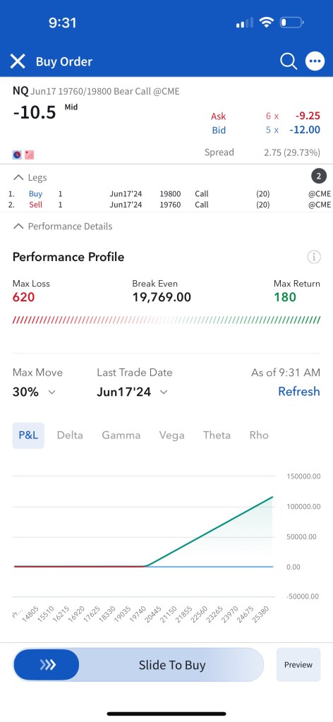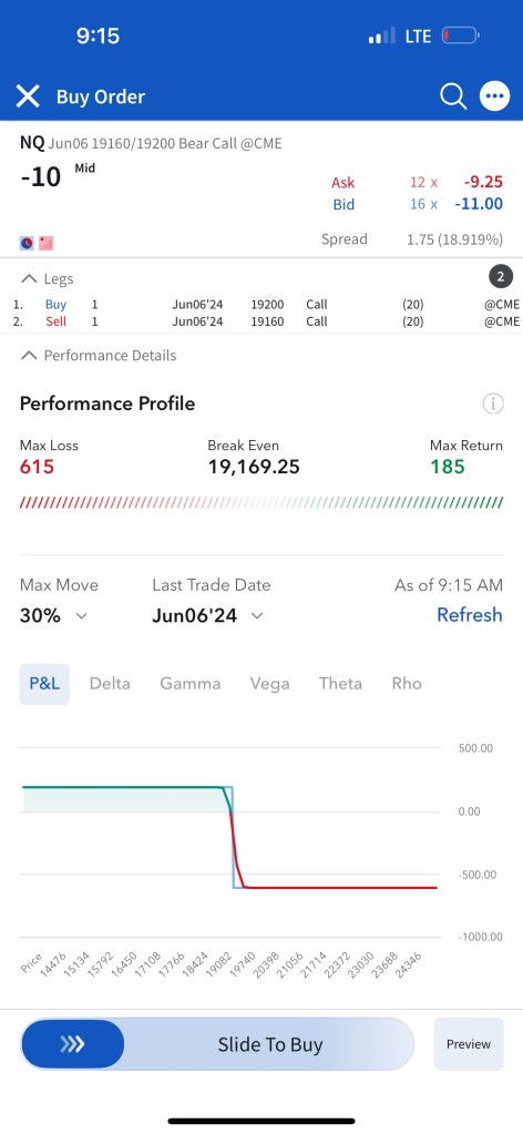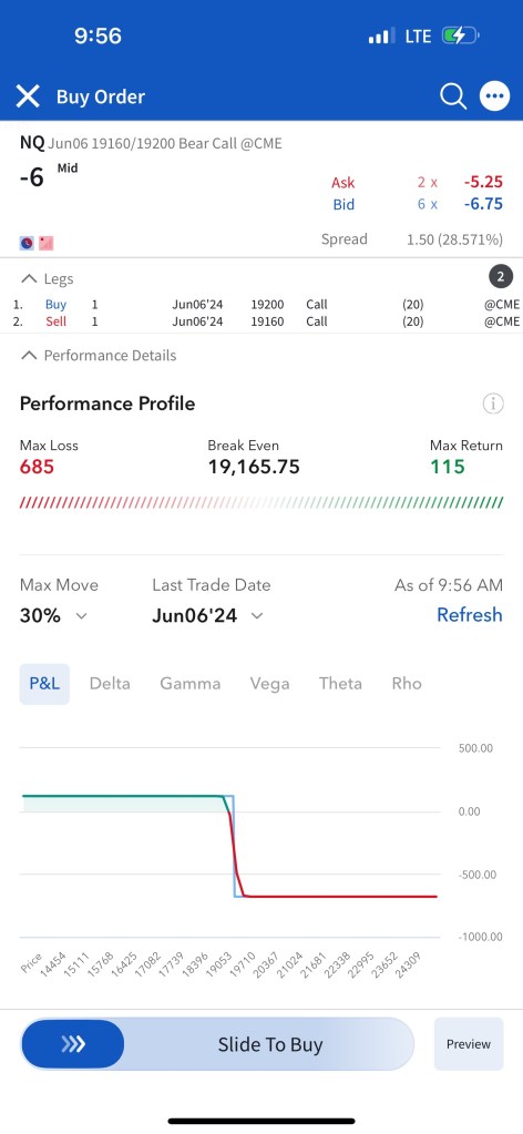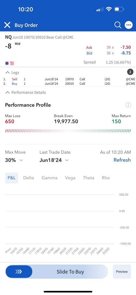Trade #1: I have followed through on the trade plan mentioned yesterday in Tomorrow’s Trade Ideas. I had to make a slight adjustment as the NQ contract that is currently the one being shown in TradingView (The one expiring Sep 20) is not liquid enough, so I continued to trade the one expiring June 21st. The resistance of $20,275 I mentioned in Tomorrow’s Trade Ideas is equivalent to a resistance of $20,000 for the June 21 NQ contract. I have sold 5 bear call spreads with a short strike price of $20,020 and a long strike price of $20,060 for a premium of $12 per contract. Netting me a total of $1,200 in premium ($12*5*20). Each contract represents exposure to 20 futures. My max loss here is $2,800. I will be looking to close if and when NQ makes a move to the downside.