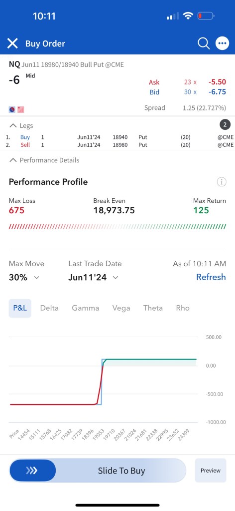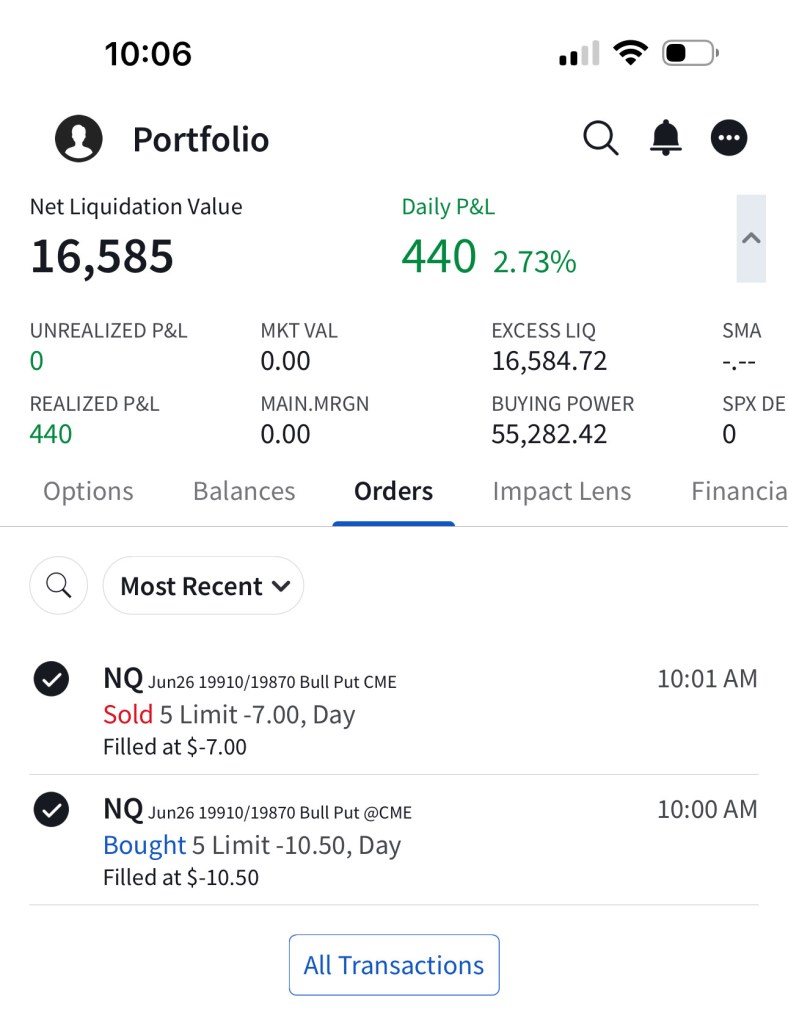 Trade #1: I have followed through on the trade plan mentioned yesterday in Tomorrow’s Trade Ideas. I had to make a slight adjustment as the NQ contract that is currently the one being shown in TradingView (The one expiring Sep 20) is not liquid enough, so I continued to trade the one expiring June 21st. The support of $19,800 I mentioned in Tomorrow’s Trade Ideas is equivalent to a support of $19,550 for the June 21 NQ contract. I have “paper” sold 5 bull put spreads with a short strike price of $19,530 and a long strike price of $19,490 for a premium of $10.25 per contract. Netting me a total of $1,025 in premium ($10.25*5*20). Each contract represents exposure to 20 futures. My max loss here is $2,975. I will be looking to close if and when NQ makes a move to the upside. Since it’s a paper trade, I assumed a price of $10.25 which is the mid-point between the bid and the ask as shown in the screenshot.