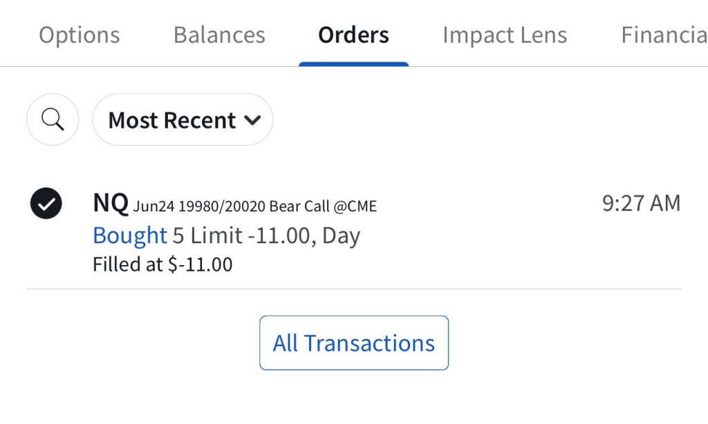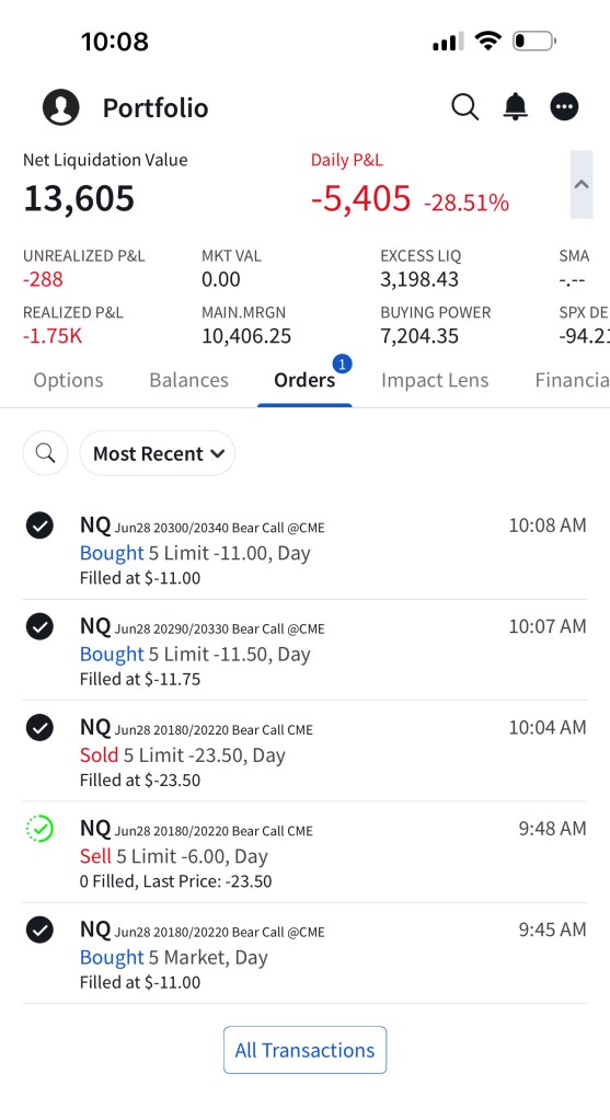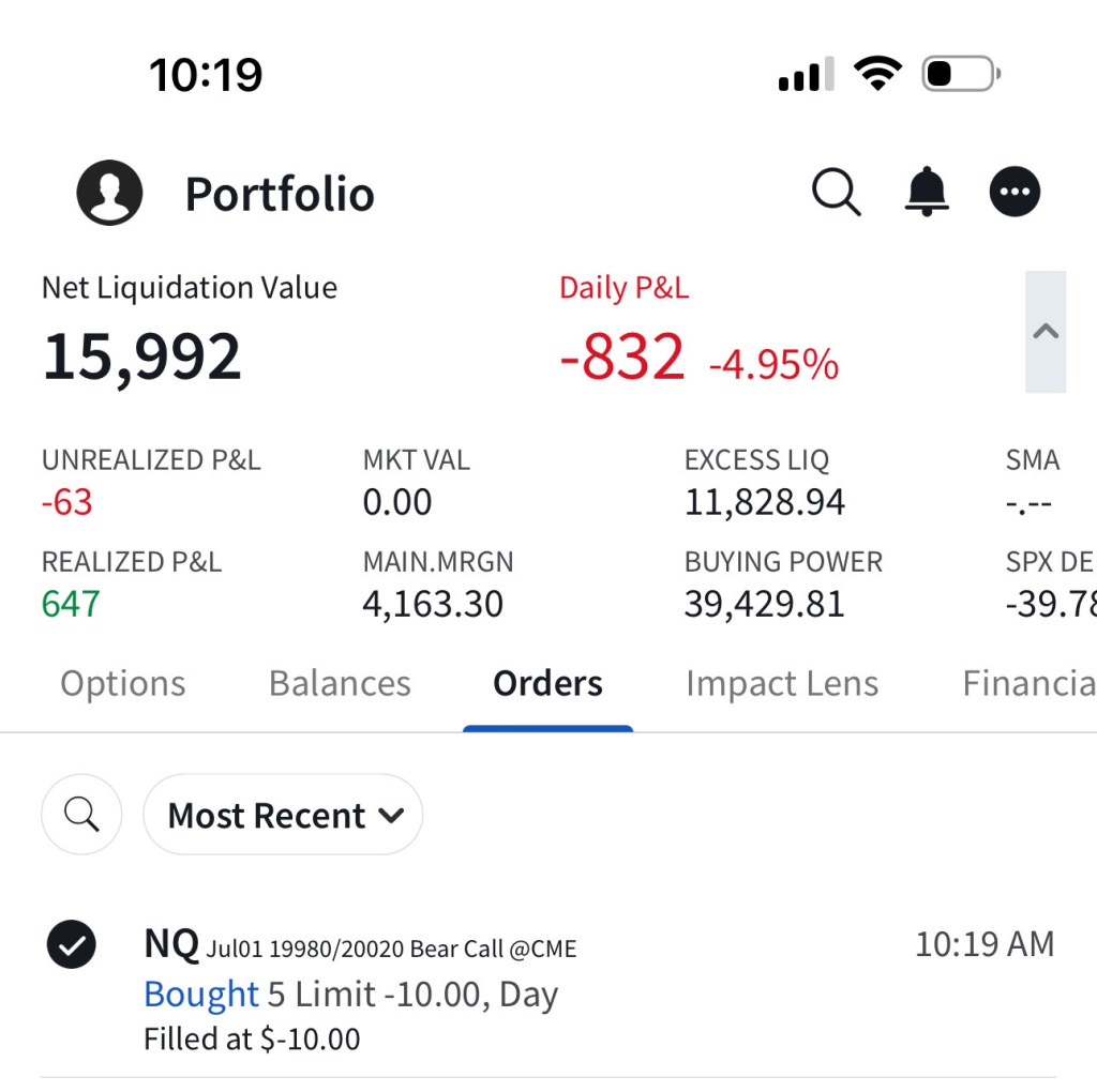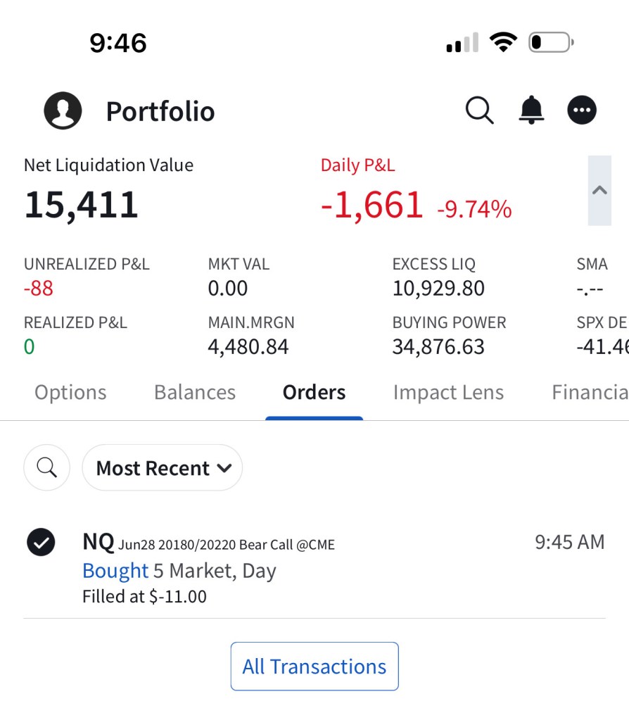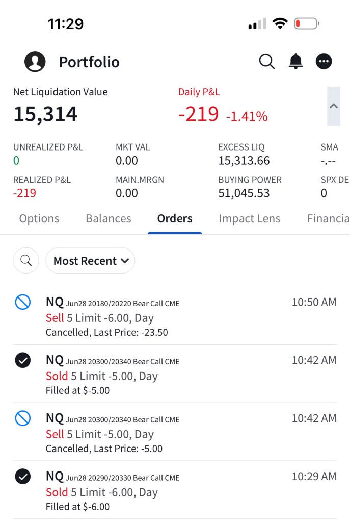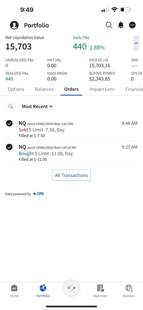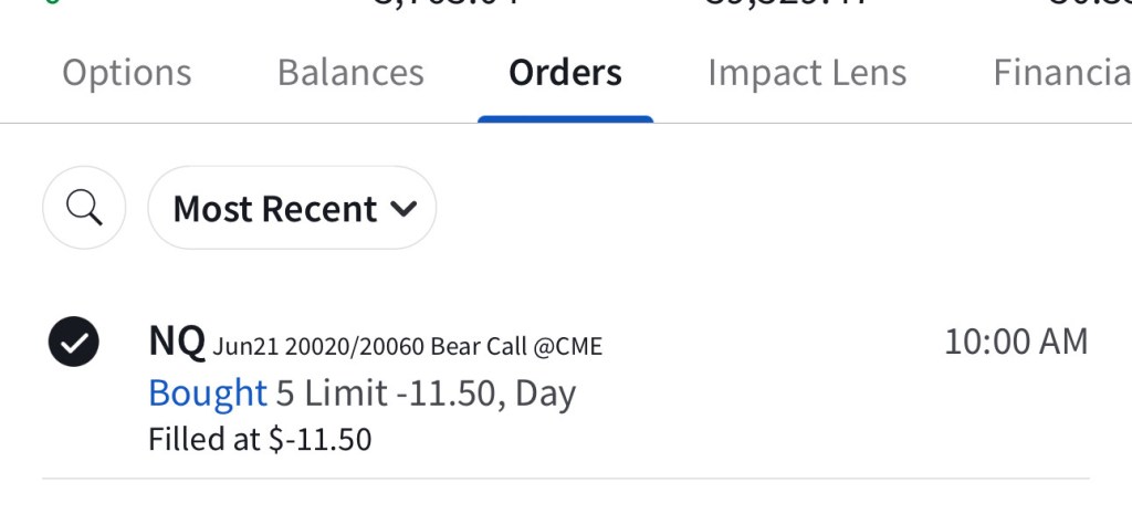 I have sold 5 bear call spreads with a short strike price of $20,290 and a long strike price of $20,330 for a premium of $11.75 per contract. Netting me a total of $1,175 in premium ($11.75*5*20). Each contract represents exposure to 20 futures. My max loss here is $2,825. I will be looking to close if and when NQ makes a move to the downside.