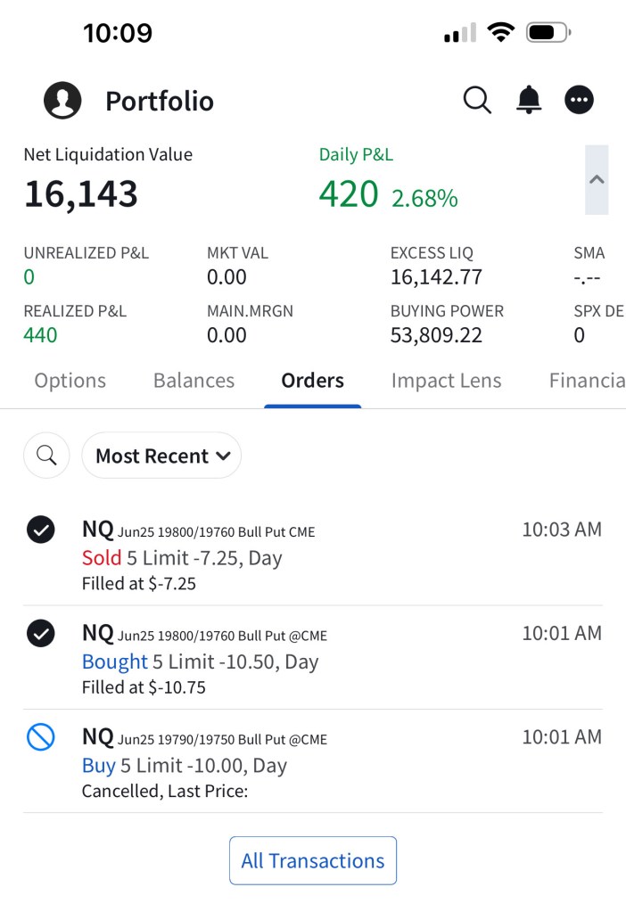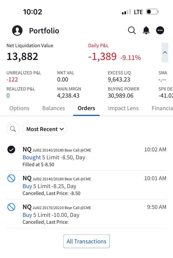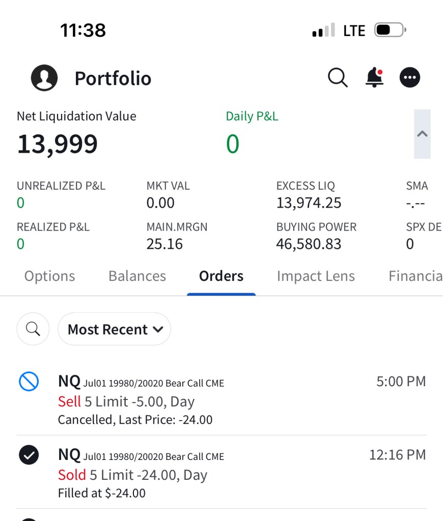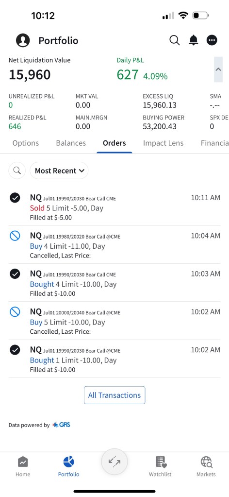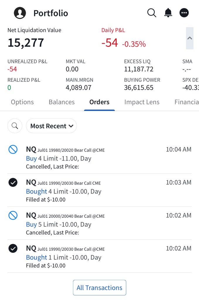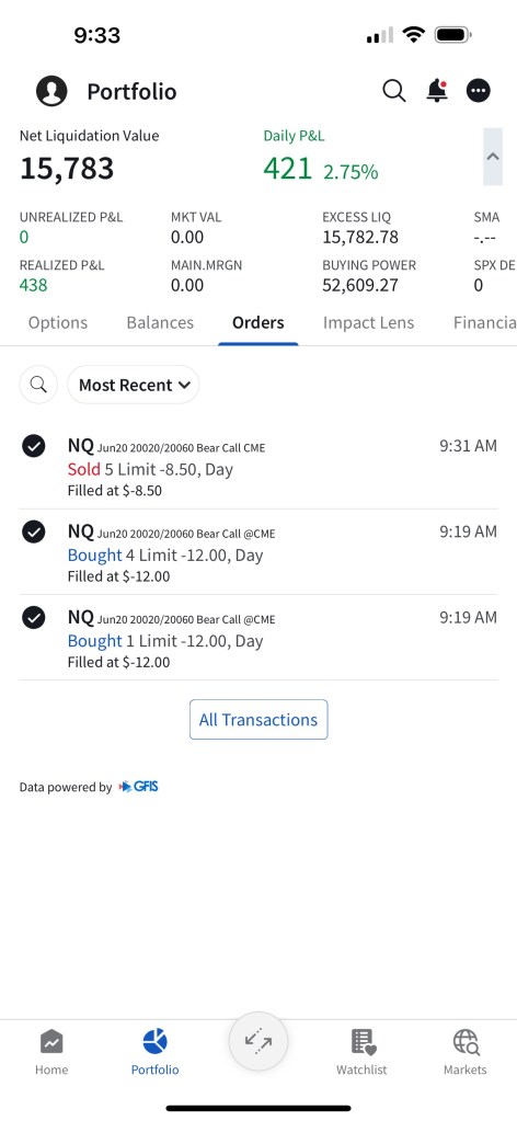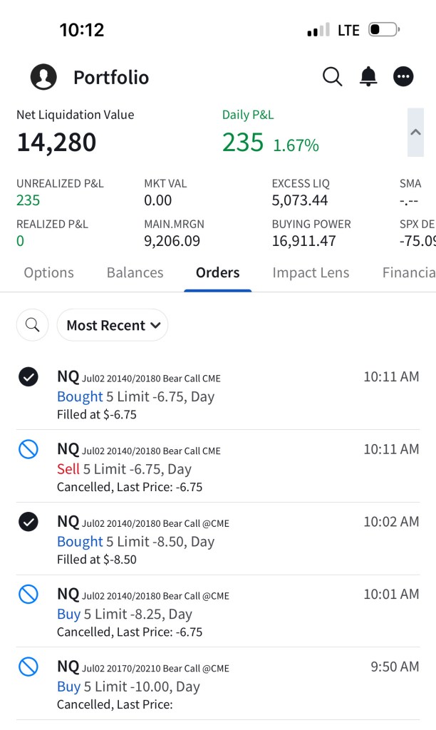 I have sold 5 bear call spreads with a short strike price of $20,290 and a long strike price of $20,330 for a premium of $11.75 per contract. Netting me a total of $1,175 in premium ($11.75*5*20). Each contract represents exposure to 20 futures. My max loss here is $2,825. I will be looking to close if and when NQ makes a move to the downside.