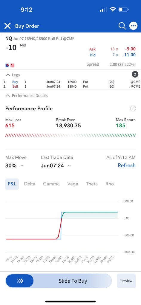Trade #1: I have followed through on the trade plan mentioned yesterday in Tomorrow’s Trade Ideas. I have “paper” sold 5 bull put spreads with a short strike price of $18,940 and a long strike price of $18,900 for a premium of $10 per contract. Netting me a total of $1,000 in premium ($10*5*20). Each contract represents exposure to 20 futures. My max loss here is $3,000. I will be looking to close if and when NQ makes a move to the upside in the first 1 hour of trading. Since it’s a paper trade, I assumed a price of $10 which is the mid-point between the bid and the ask as shown in the screenshot.
