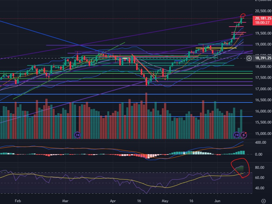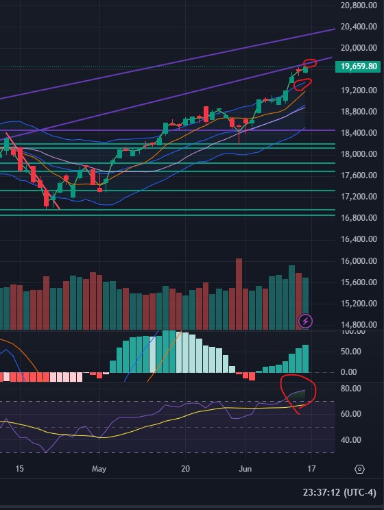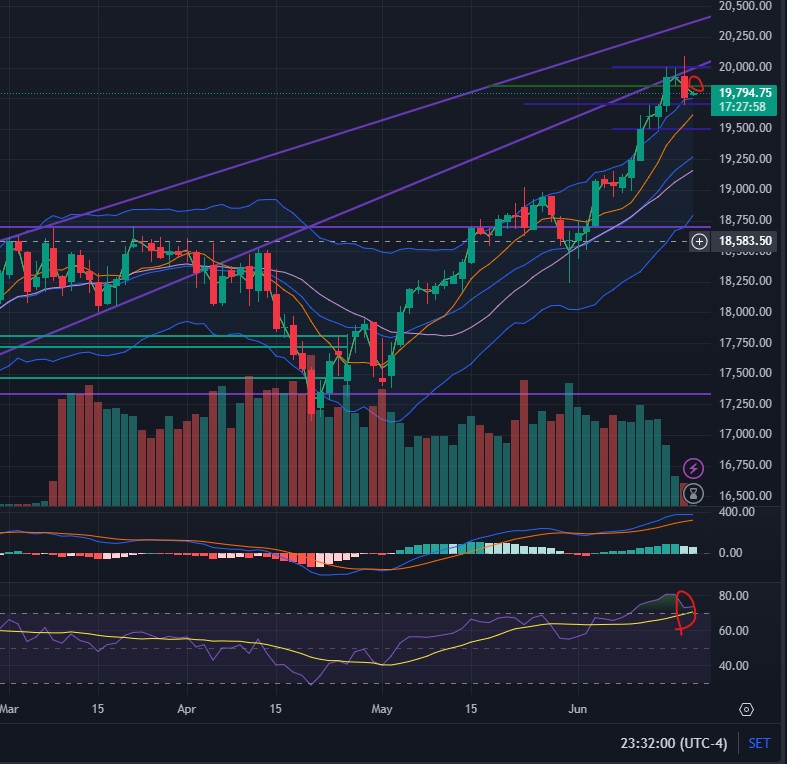 Today NQ finished the day up around 0.5% on the a continuation of yesterday’s rally. NQ tested and rejected its support at $19,800 around 10 AM and 12 PM today. The fact that it tested the level twice is more bearish than bullish, especially considering that the bounces after reaching that level weren’t great. NDX hit its long term resistance line and pulled back slightly off of it. Both NDX and NQ are now trading in overbought territory on the 4 hour and 1 day charts based on their RSIs.
