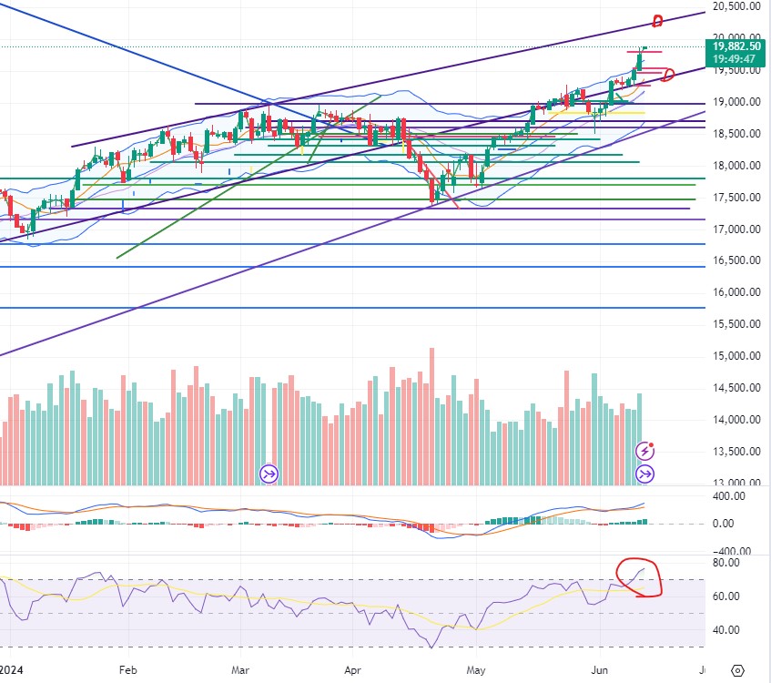 Today NQ touched and softly rejected its $20,275 long term resistance level, which is the upper line of a long term channel that NQ has traded in in the past. It now trades only $50 away from this level. NDX remains convincingly above its $19,800 support level. MSFT touched its long term resistance level of $450 and rejected it, closing the day almost $4 lower than that. AAPL also fell after coming close to its all time high today. AAPL touched $219 but closed the day almost $5 lower. NVDA is overbought on all 3 charts and has 18 daily candles outside the upper kelter channel. NQ and NDX are both overbought based on the RSI on their 4 hour and 1 day charts. NDX has now traded outside of its upper Kelter channel for the last 5 days. Trading outside of the upper kelter channel is a potential sign of extreme unsustainable (in the short term) buying.