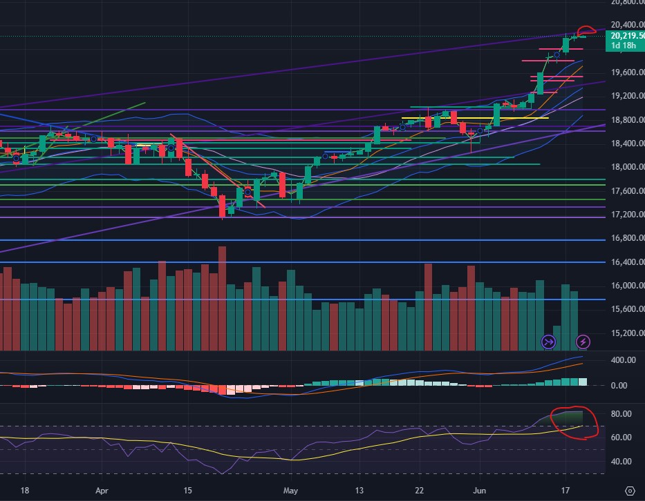 NQ’s chart with levels and 1 Day chart RSI circled in red: