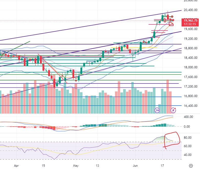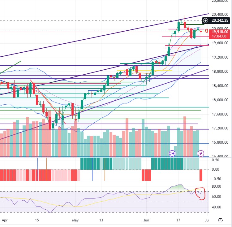 Today NQ dropped convincingly below its $20,275 long term resistance level, which is the upper line of a long term channel that NQ has traded in in the past. It now trades only $60 away from a soft support level of $20,000 and only $70 below the soft resistance of $20,130. NDX also closed below its $19,800 level. MSFT dropped to its 9 day moving average and rejected it, closing the day almost where it opened. AAPL fell more than $4 and is now trading close to its 9 day moving average. NVDA broke above its ATH and then crashed down more than $10. The stock is now trading right at its upper kelter channel on the daily chart after 18 daily candles outside the upper kelter channel. NQ and NDX are both overbought based on the RSI on their 1 day charts. NDX has now traded outside of its upper Kelter channel for the last 6 days. Trading outside of the upper kelter channel is a potential sign of extreme unsustainable (in the short term) buying.