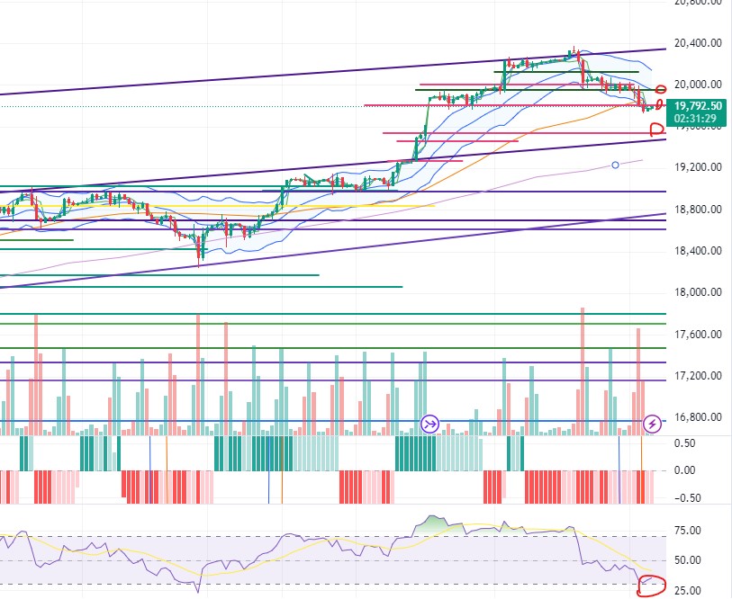 Today, the market traded in a tight range, bouncing between two of the levels identified yesterday: the $19,950 support and the $20,000 resistance. After market close, Micron (MU), a maker of memory chips, released its earnings. Although it beat on earnings, it did not beat on revenues, causing the stock and the Nasdaq to drop in after-hours trading. MU mentioned that its AI-focused memory chips are sold out until 2025 and that its data center business grew by over 50%. Despite the negative market reaction to its earnings, the company reaffirmed the general market consensus of a growth boom in AI.