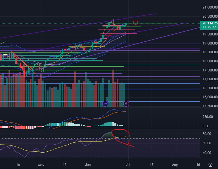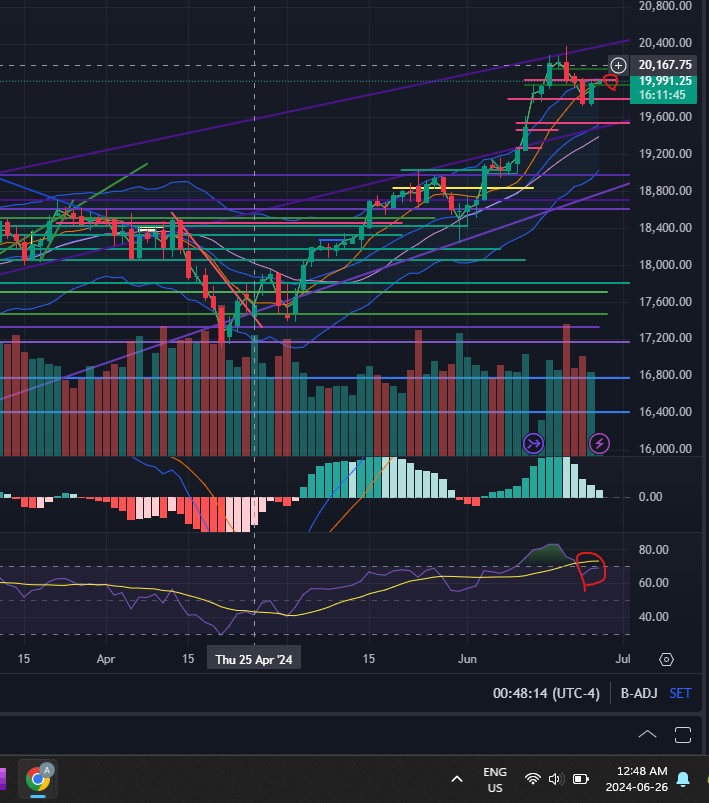 NQ’s chart with levels and 4 Hour chart RSI circled in red: