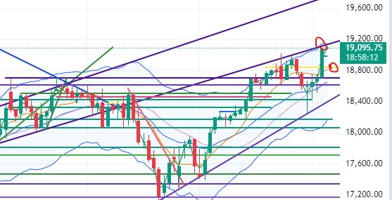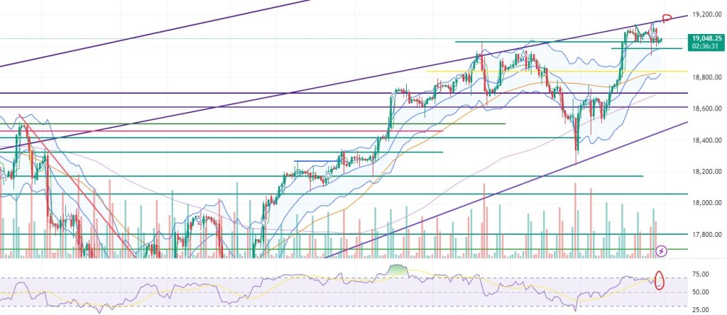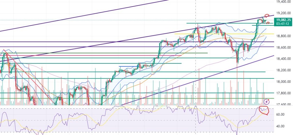 I did not place any trades today, keeping in accordance with my “Trading Strategy”. I don’t trade on days when Fed interest rate decisions are being made as they tend to be too volatile. This decision was validated today as the Nasdaq rallied more than 1.3%, exemplifying an unusually volatile day. The rally came as the Fed held interest rates but said they would likely be cutting rates once this year. Yields on US 10-year treasuries dropped more than 0.1% today in relation to the FOMC decision and guidance. NQ broke out from its strong resistance around the $19,200 area and is now trading convincingly above that area and is now in the middle of a channel I have marked in a picture below. NDX (Nasdaq Index) however reached a level just below its long term resistance. Both NDX and NQ are now trading in overbought territory on the 1 hour, 4 hour and 1 day charts.